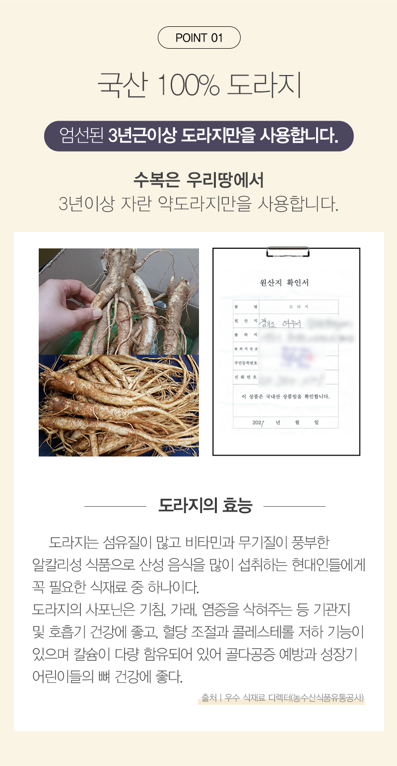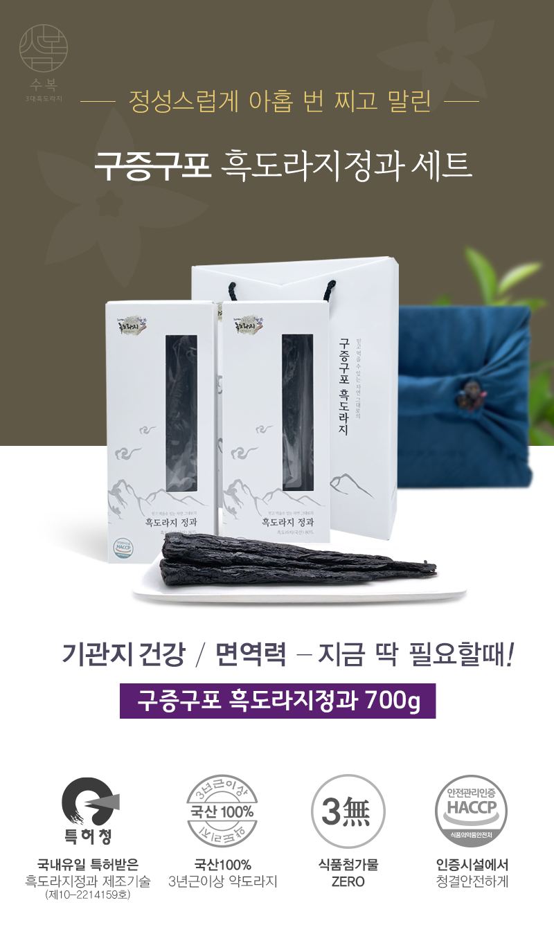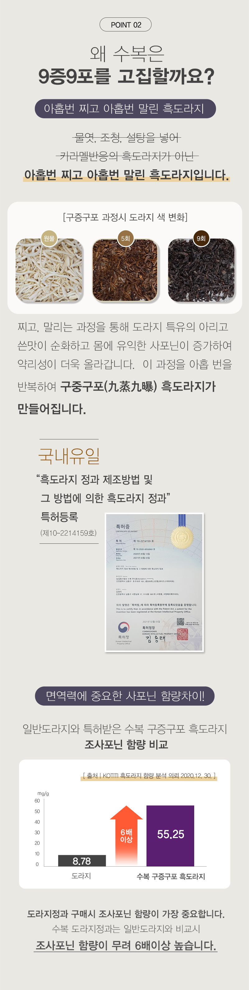 특허받은 제조 기술로 완성된 수복 흑도라지정과는 기관지에 좋은 조사포닌 함량 원물대비 6배이상 높으며 면역력에 좋은 플라티코딘D함량이 증가된 기술까지 특허출원하였습니다.