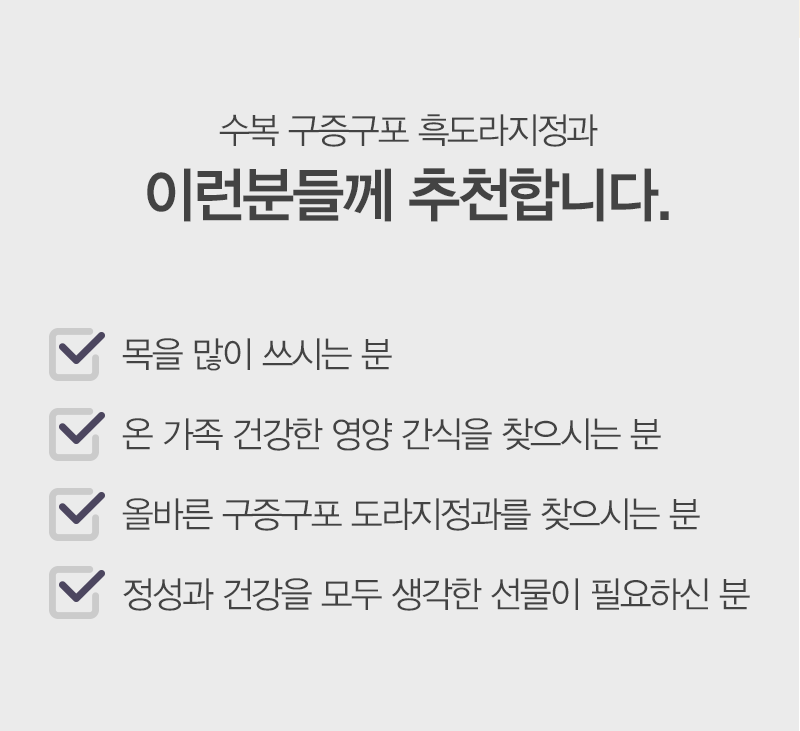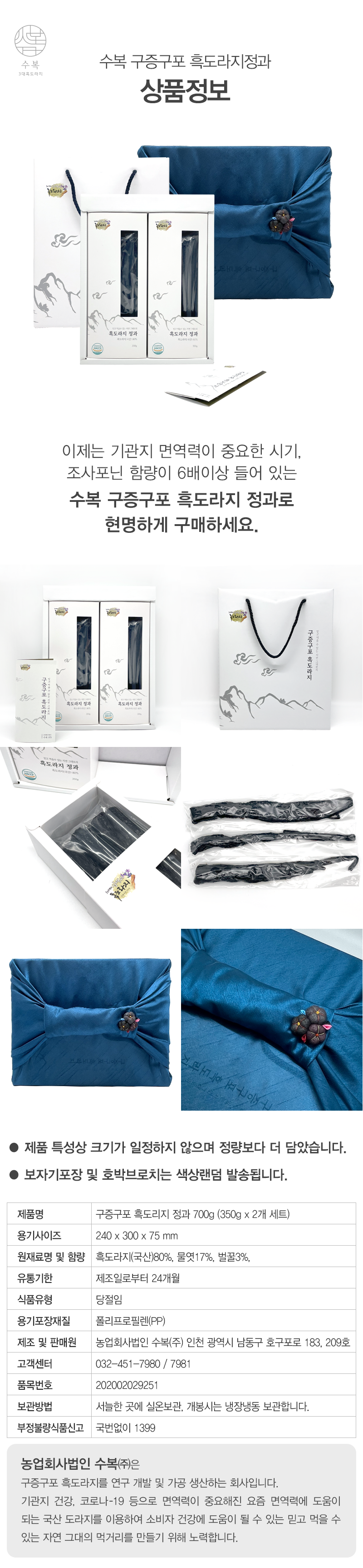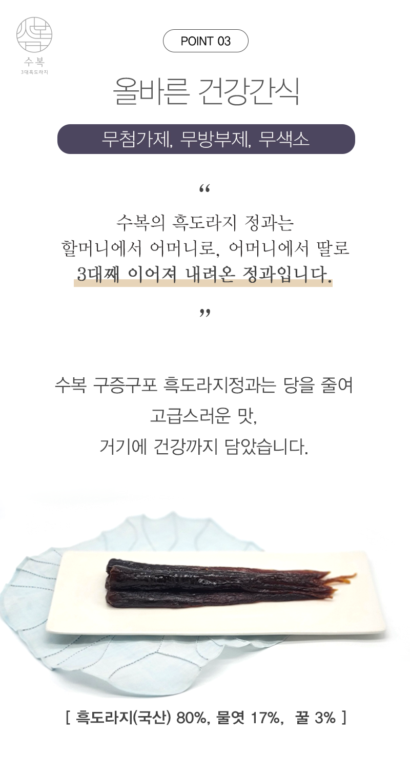 수복 구증구포 흑도라지 정과는 100% 국산 도라지로 적을 당을 사용하여 건강하게 만들었습니다.